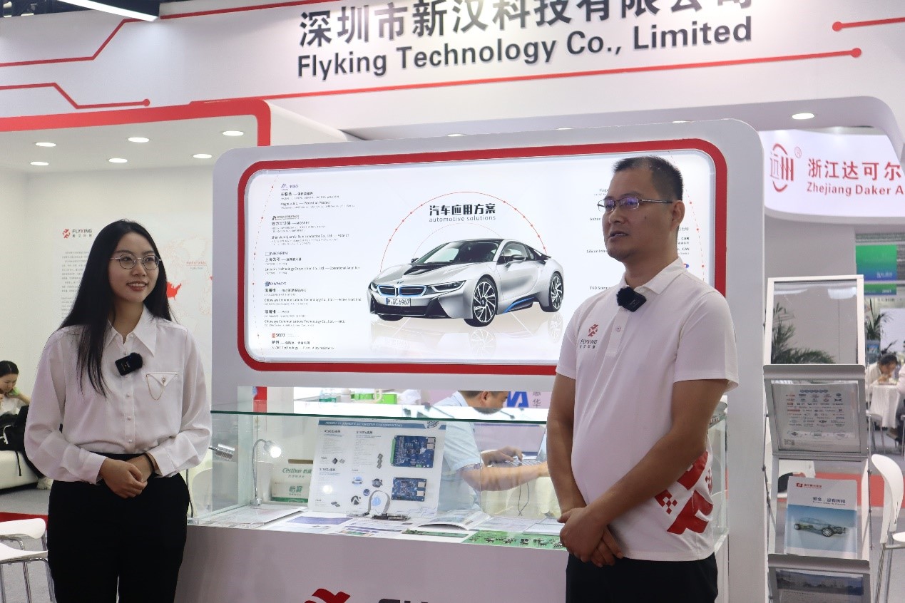 Meanwhile, many professional media were attracted by Flyking’s booth. During our exhibition, Mr. Cao, Sales Director of Kaimeirui, and Mr. Chen, Sales Director of Grand Vision, were interviewed by NEAS China 2023. They introduced in detail Flyking’s services and products, including automotive-grade MCUs, connectors, and power components.