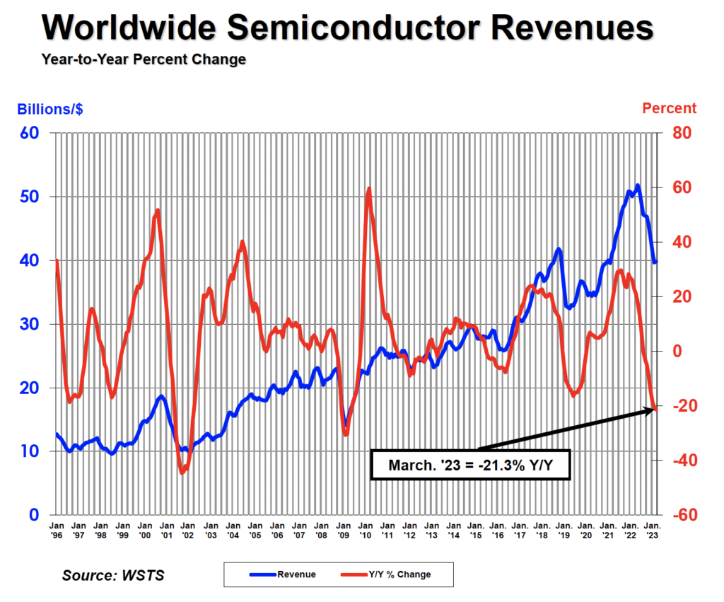 “Semiconductor sales continued to slip during the first quarter of 2023 due to market cyclicality and macroeconomic headwinds, but month-to-month sales were up in March for the first time in nearly a year, providing optimism for a rebound in the months ahead,” said John Neuffer, SIA president and CEO.